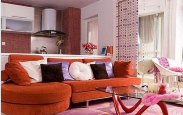 如图所示,居室采用敞开式的装饰手法,也是近年较普遍的,让空间看起来更加的宽敞。尤其是橘红色沙发 玻璃茶几的完美搭配,为居室增添了大量的亮色调。让小空间也能拥有神奇的视觉效果。